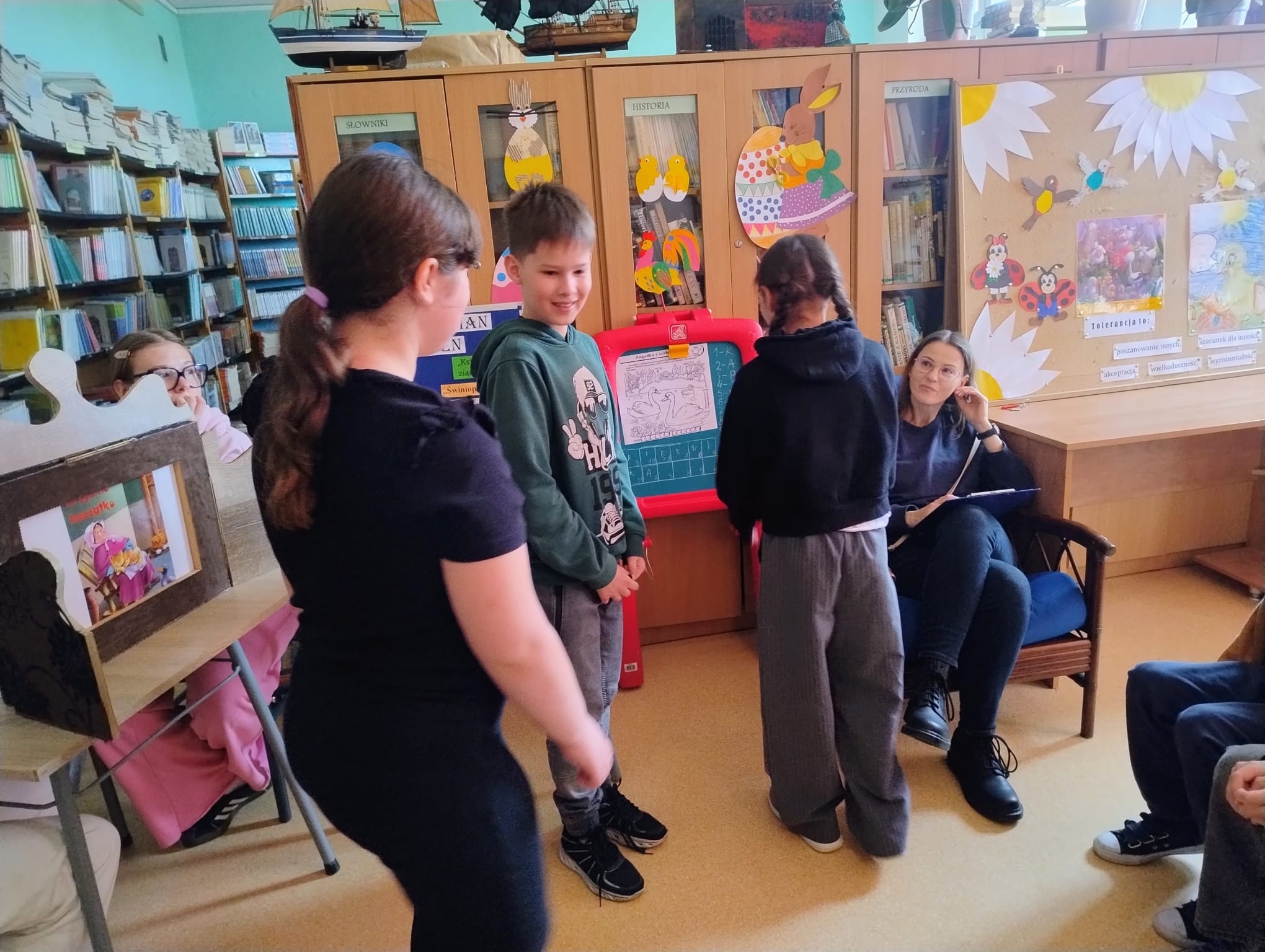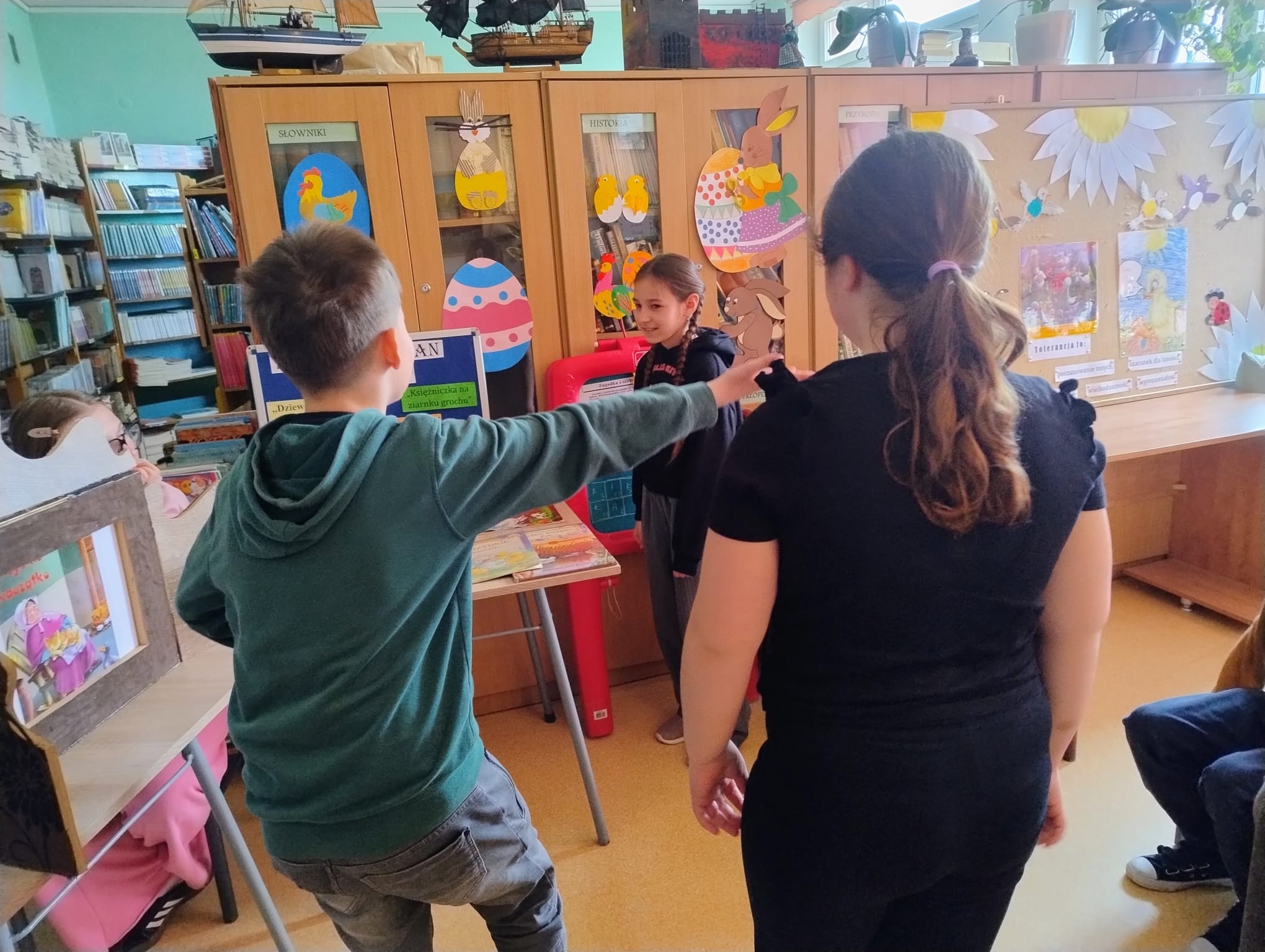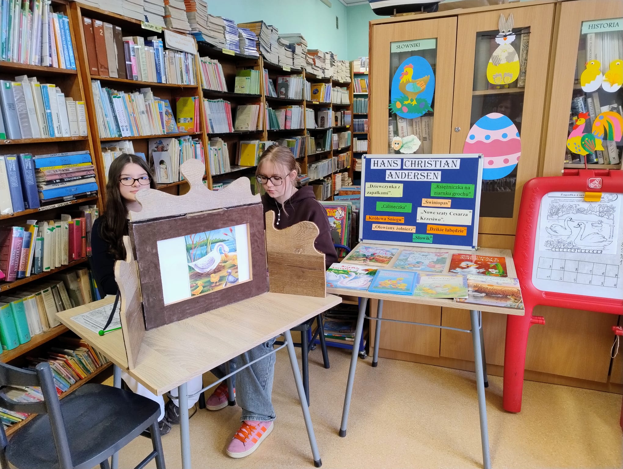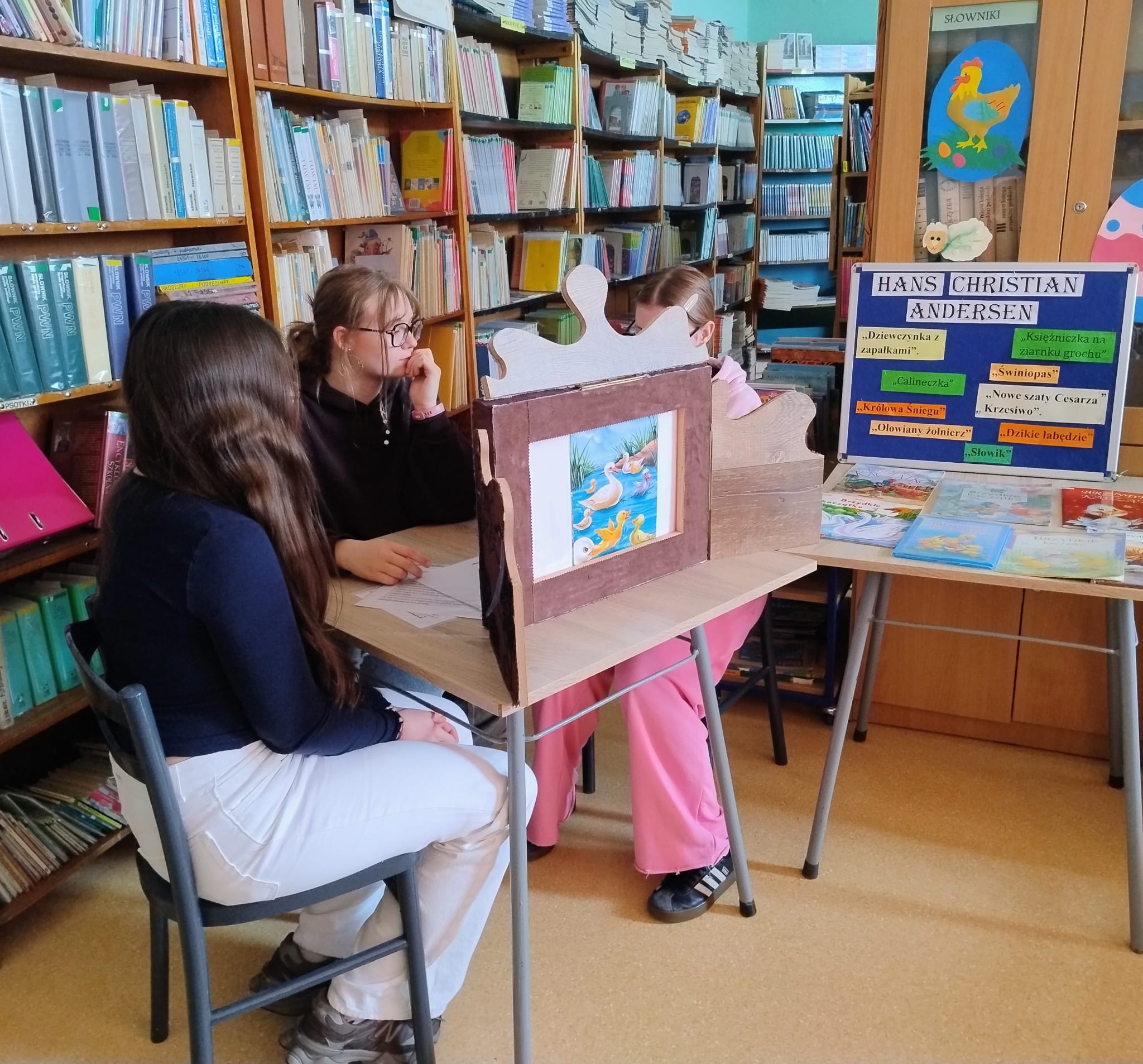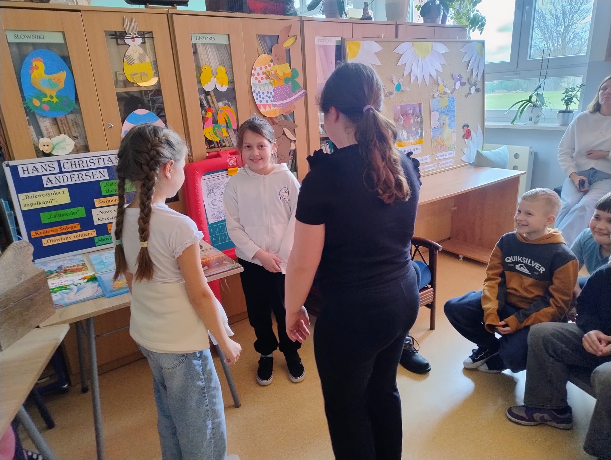 Hanna Ilnicka i Karina Kośkiewicz, uczennice z klasy szóstej, pięknie przeczytały baśń "Brzydkie Kaczątko" Hansa Christiana Andersena. Uczennice wykorzystały teatrzyk kamishibai. Natomiast Hanna Borek zadawała młodszym kolegom i koleżankom pytania i zagadki. Zajęcia prowadzone były w formie dramy. Dzieci wykazały się pomysłowością i udowodniły, że potrafią improwizować oraz wchodzić w różne w role.