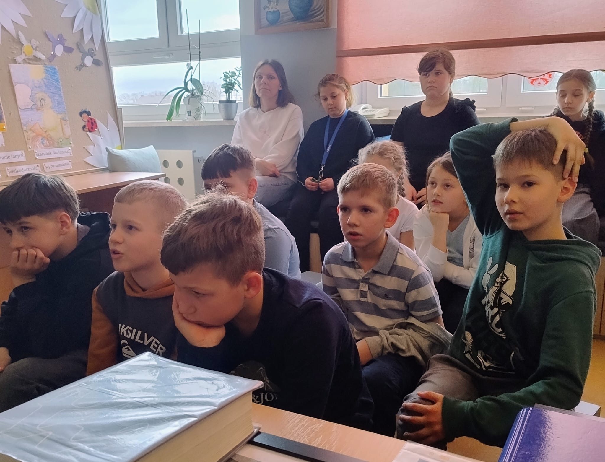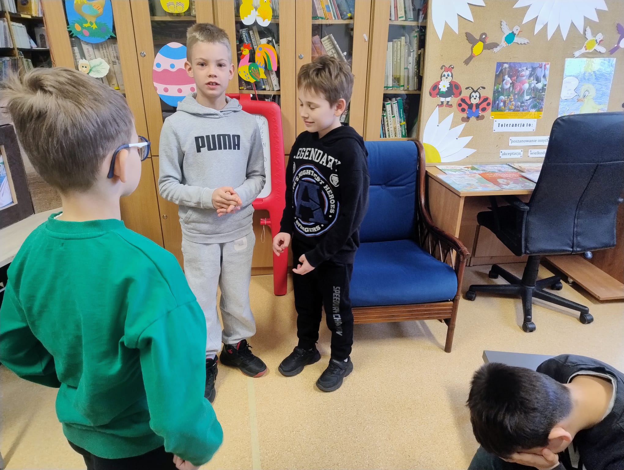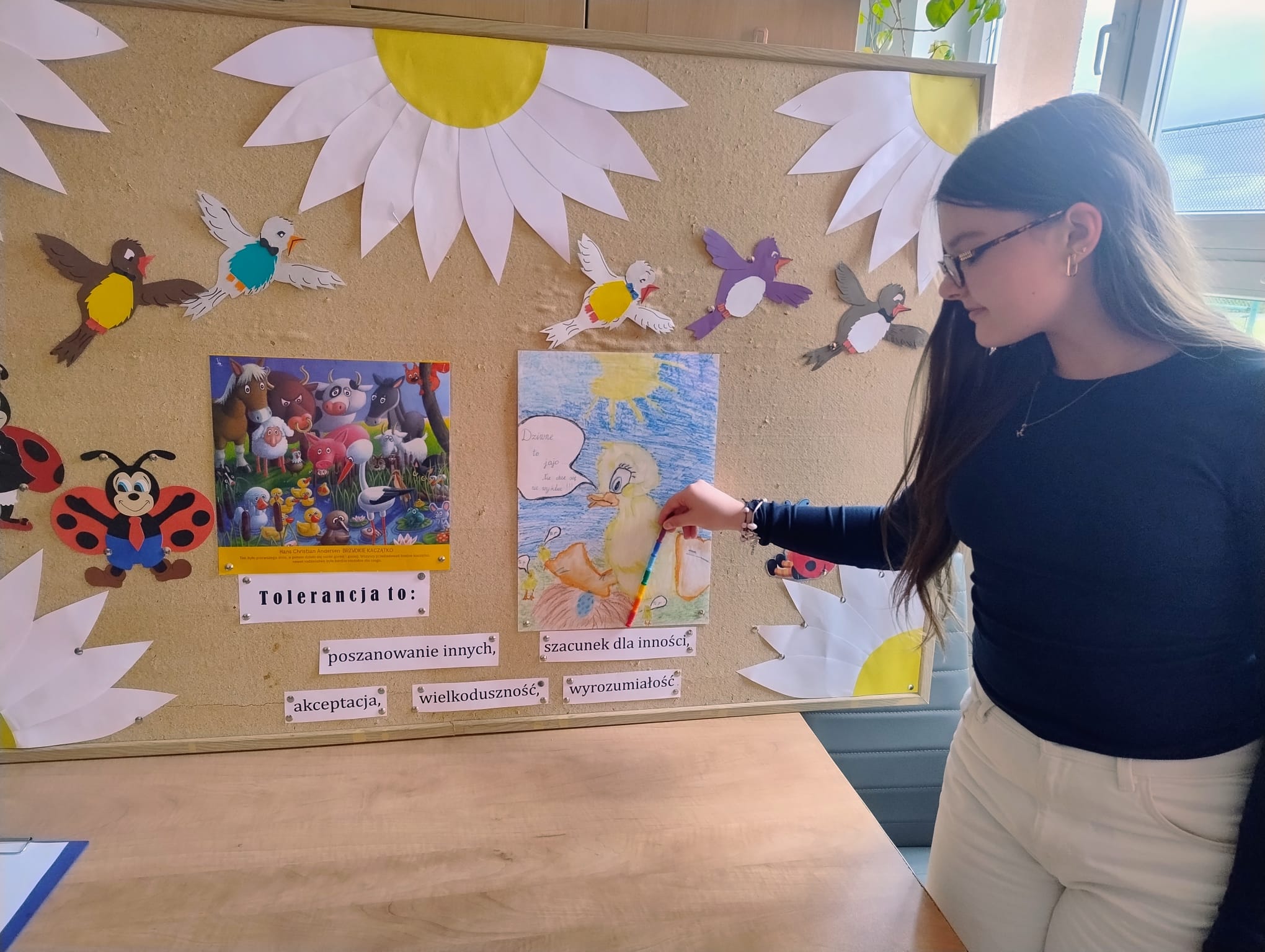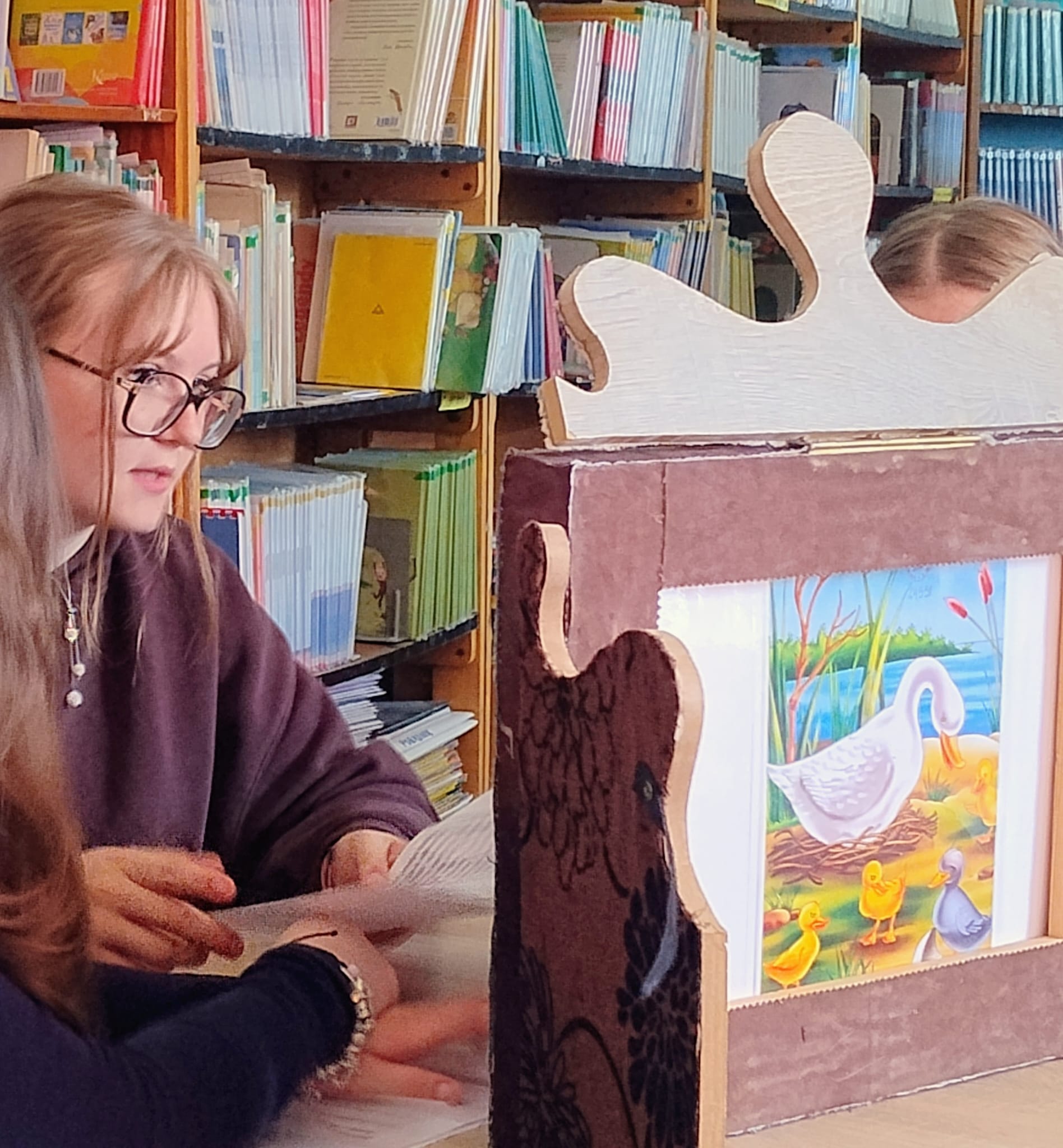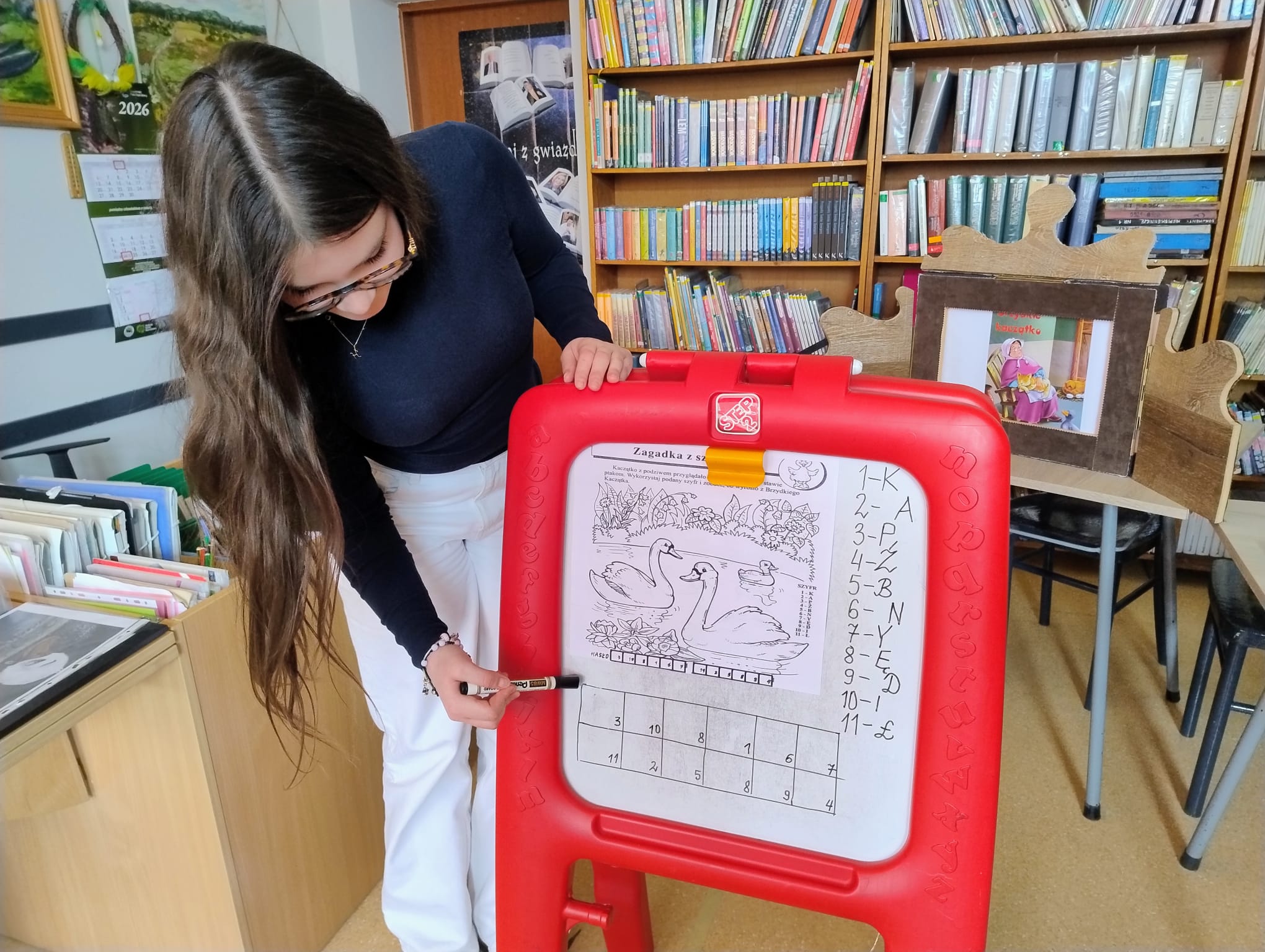 Hanna Ilnicka i Karina Kośkiewicz, uczennice z klasy szóstej, pięknie przeczytały baśń "Brzydkie Kaczątko" Hansa Christiana Andersena. Uczennice wykorzystały teatrzyk kamishibai. Natomiast Hanna Borek zadawała młodszym kolegom i koleżankom pytania i zagadki. Zajęcia prowadzone były w formie dramy. Dzieci wykazały się pomysłowością i udowodniły, że potrafią improwizować oraz wchodzić w różne w role.