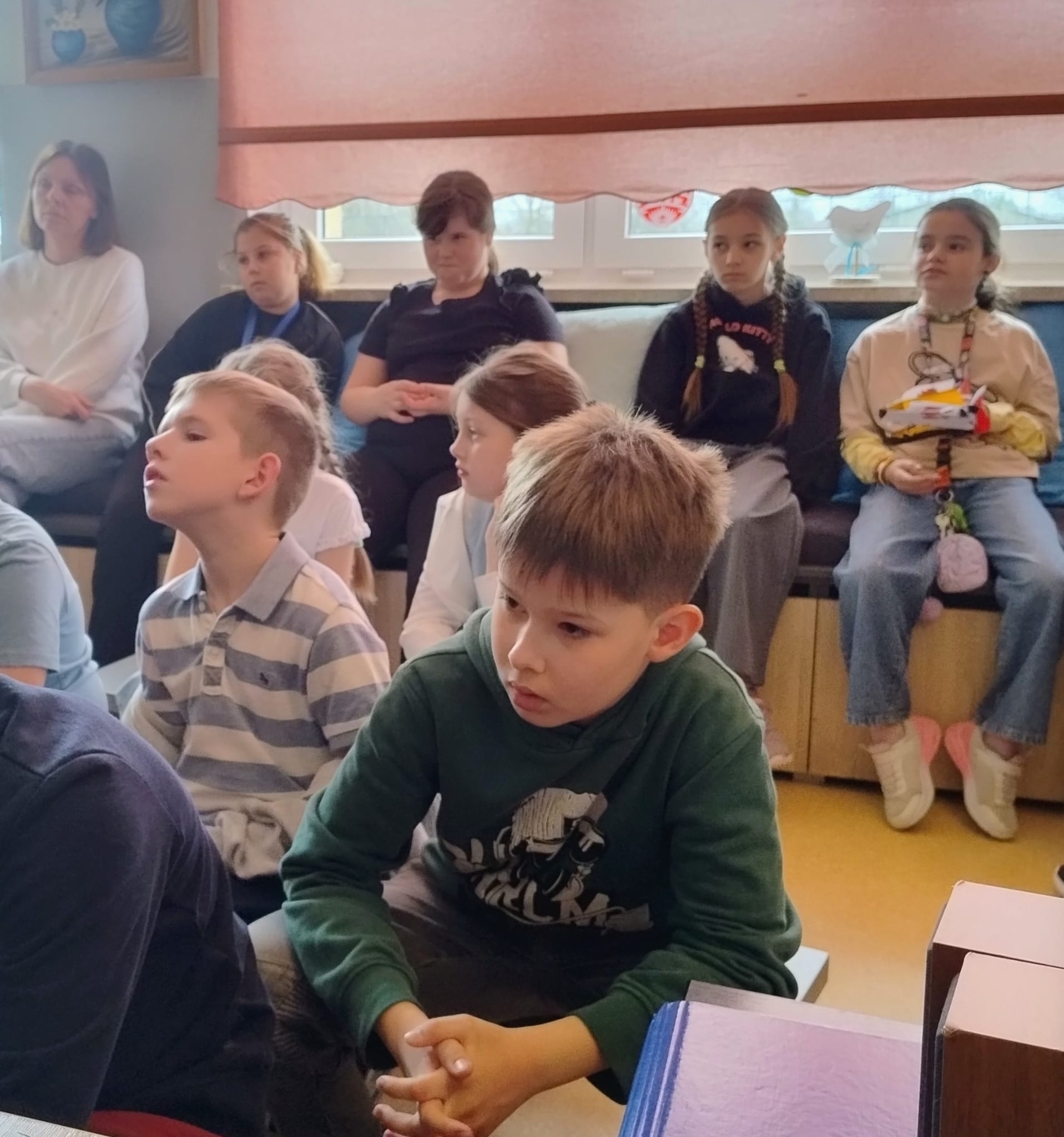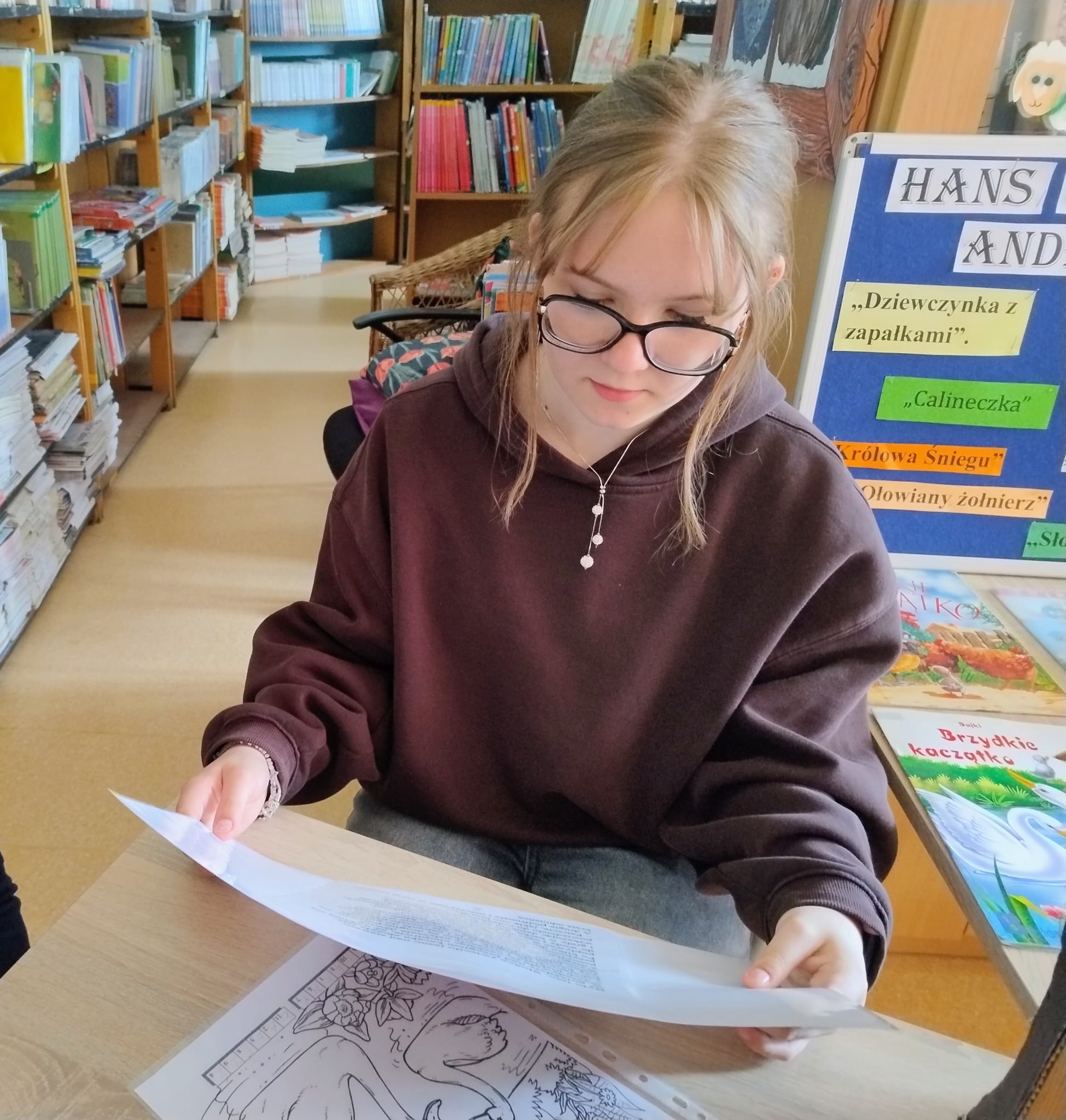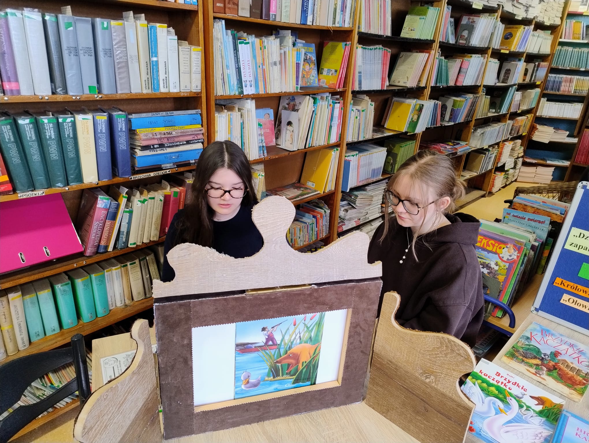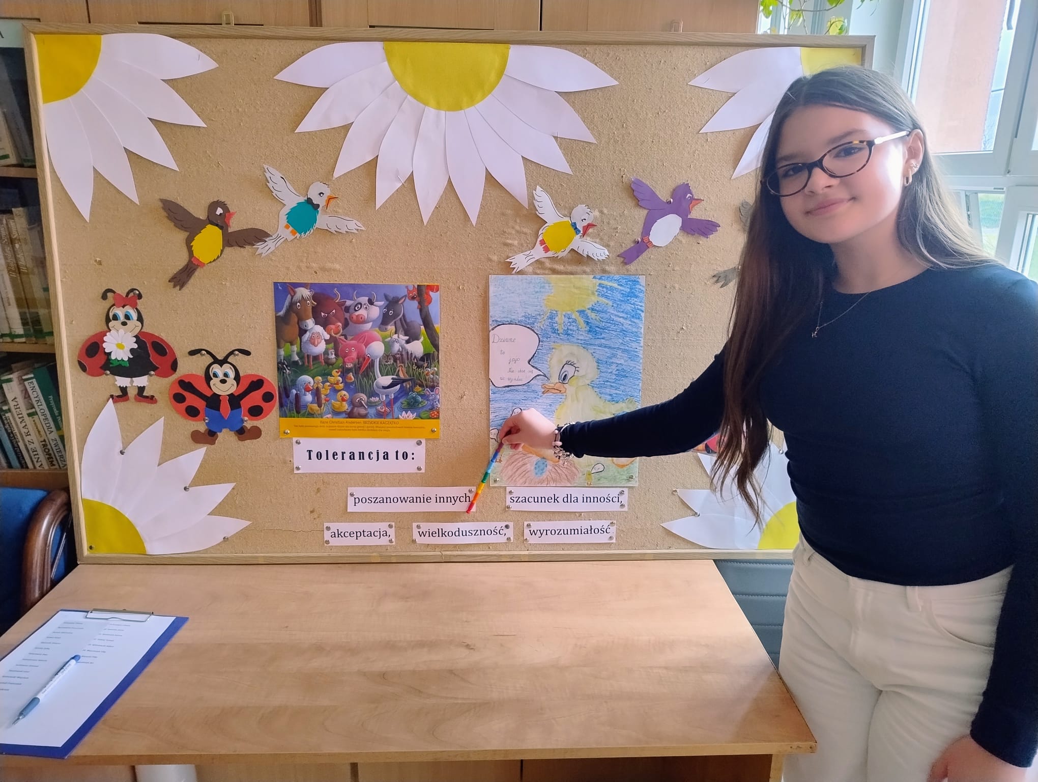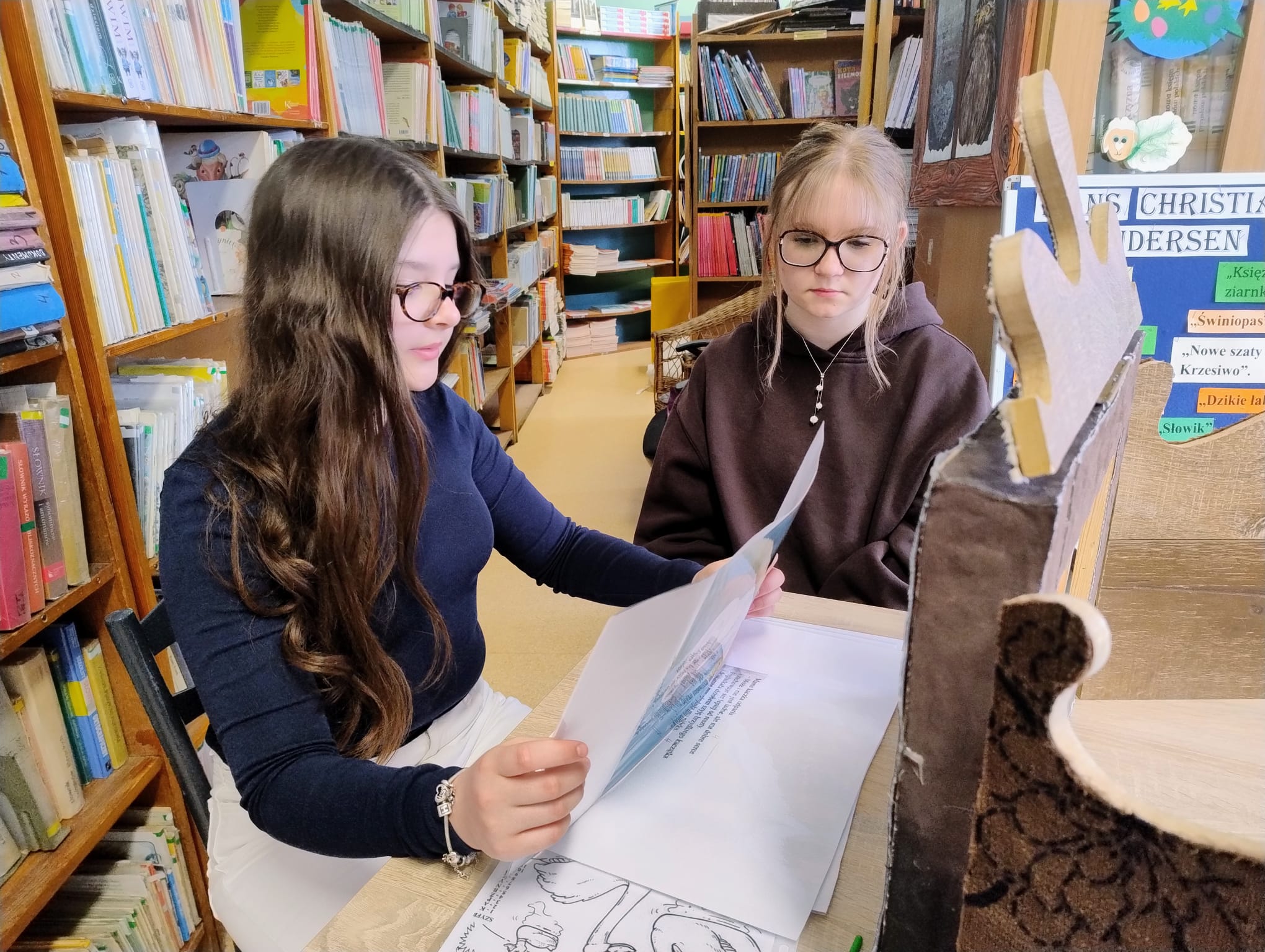 Hanna Ilnicka i Karina Kośkiewicz, uczennice z klasy szóstej, pięknie przeczytały baśń "Brzydkie Kaczątko" Hansa Christiana Andersena. Uczennice wykorzystały teatrzyk kamishibai. Natomiast Hanna Borek zadawała młodszym kolegom i koleżankom pytania i zagadki. Zajęcia prowadzone były w formie dramy. Dzieci wykazały się pomysłowością i udowodniły, że potrafią improwizować oraz wchodzić w różne w role.