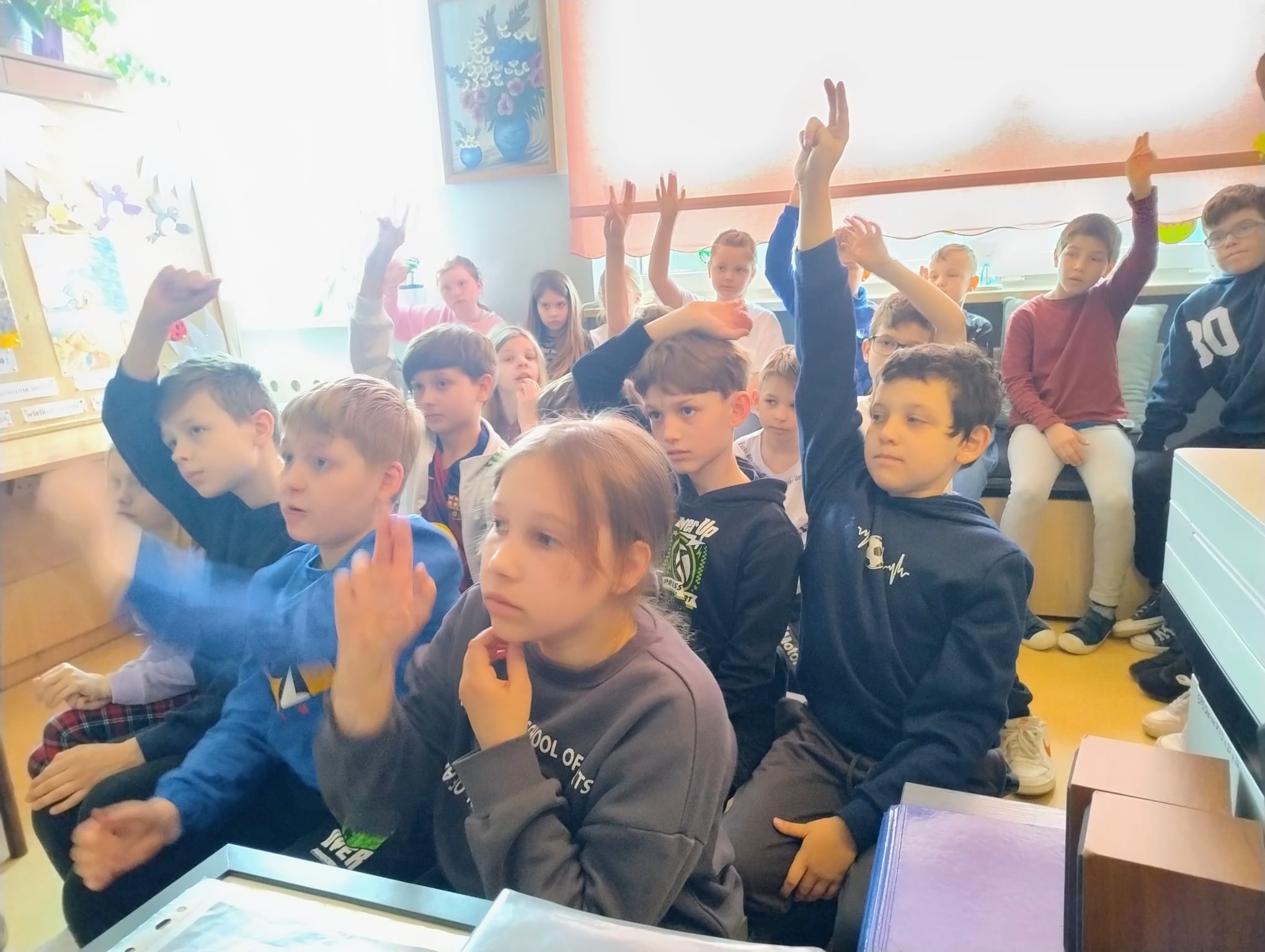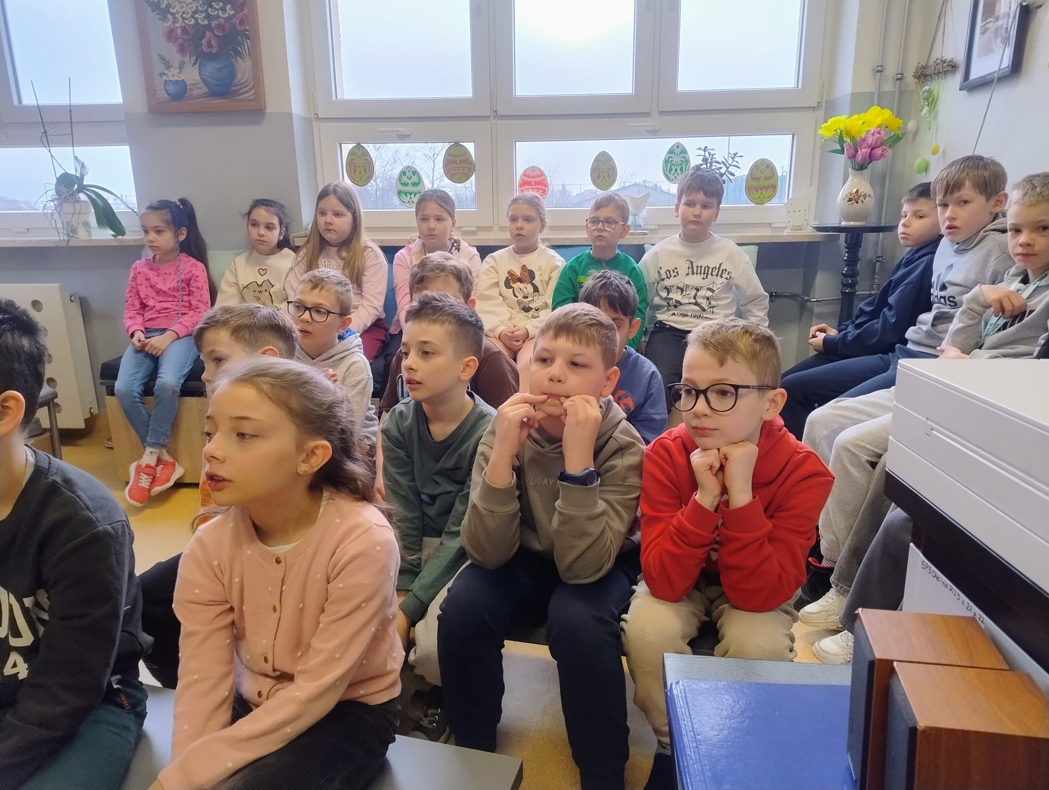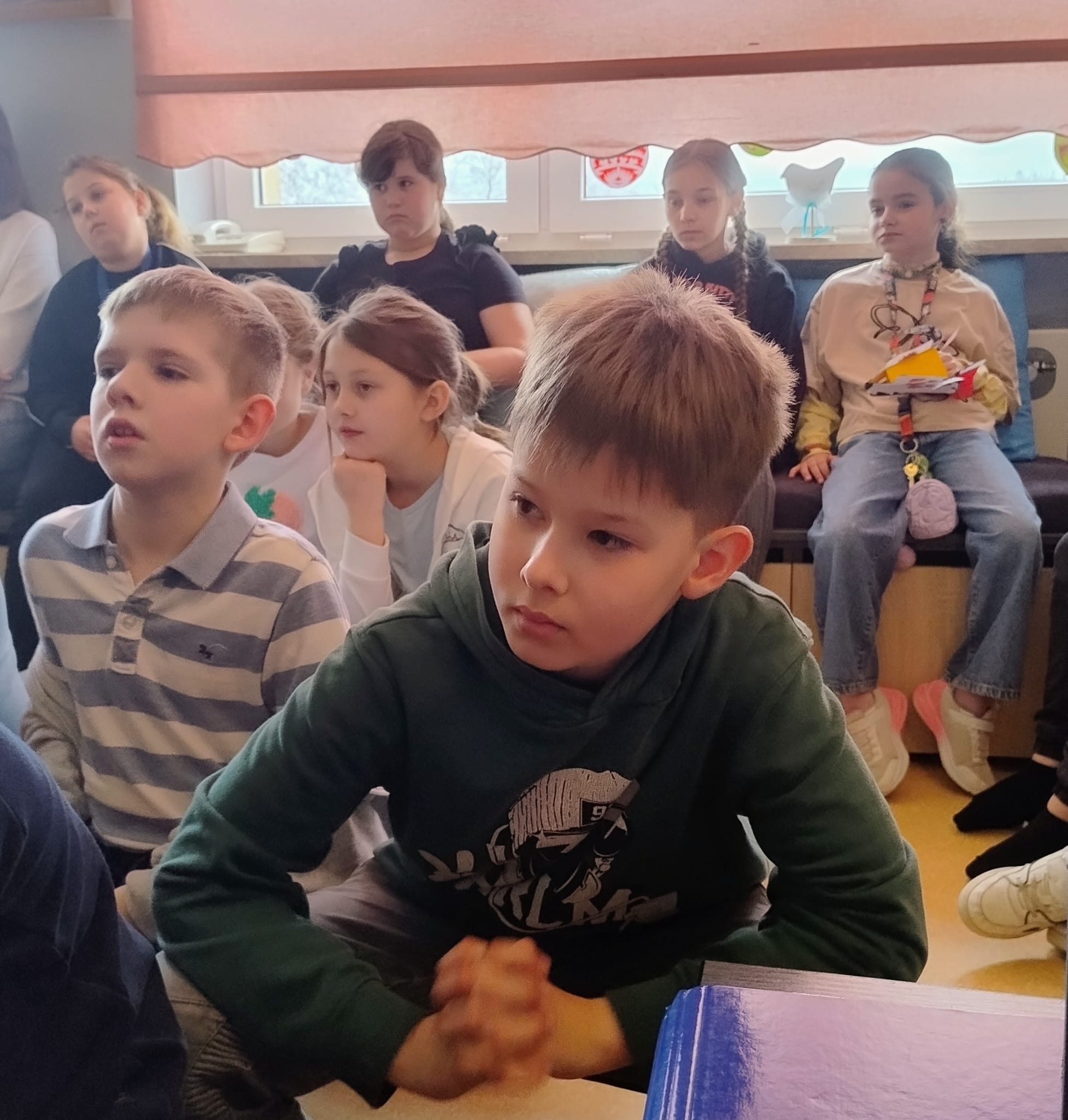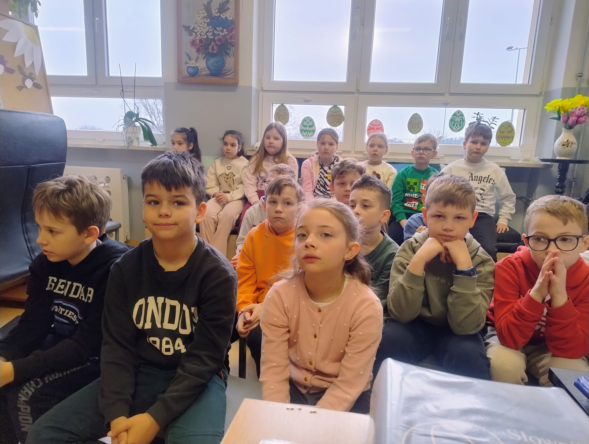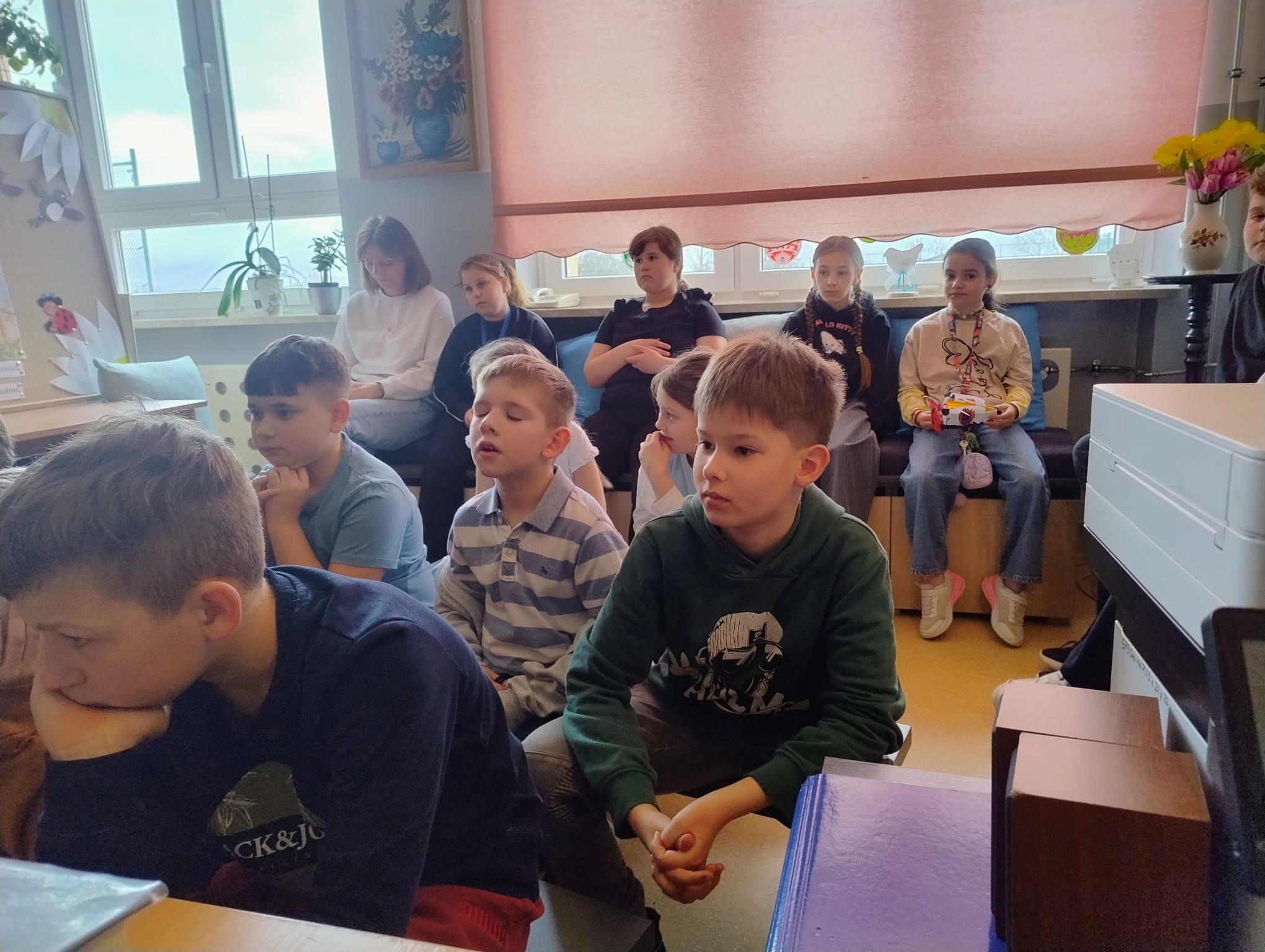 Hanna Ilnicka i Karina Kośkiewicz, uczennice z klasy szóstej, pięknie przeczytały baśń "Brzydkie Kaczątko" Hansa Christiana Andersena. Uczennice wykorzystały teatrzyk kamishibai. Natomiast Hanna Borek zadawała młodszym kolegom i koleżankom pytania i zagadki. Zajęcia prowadzone były w formie dramy. Dzieci wykazały się pomysłowością i udowodniły, że potrafią improwizować oraz wchodzić w różne w role.