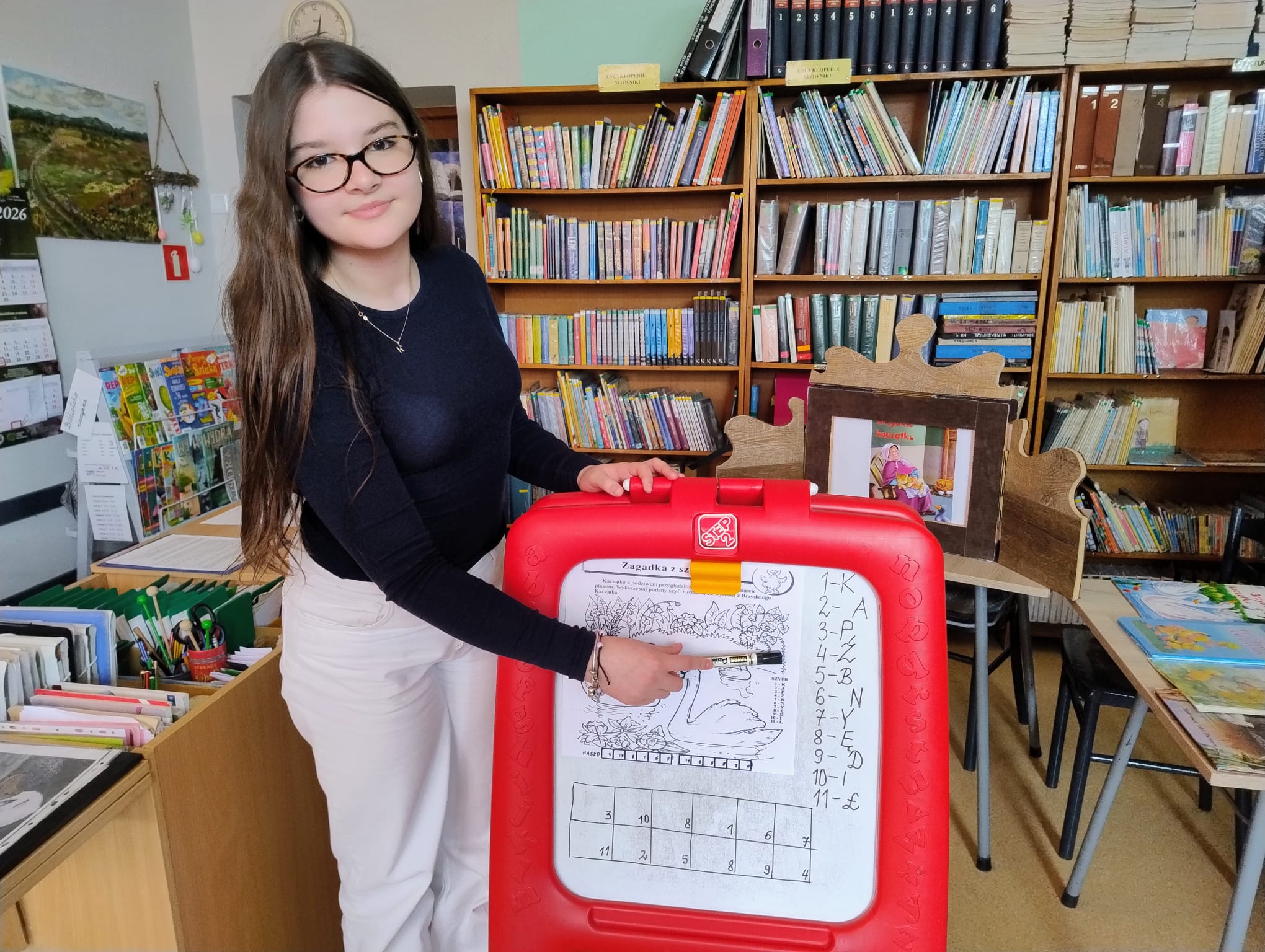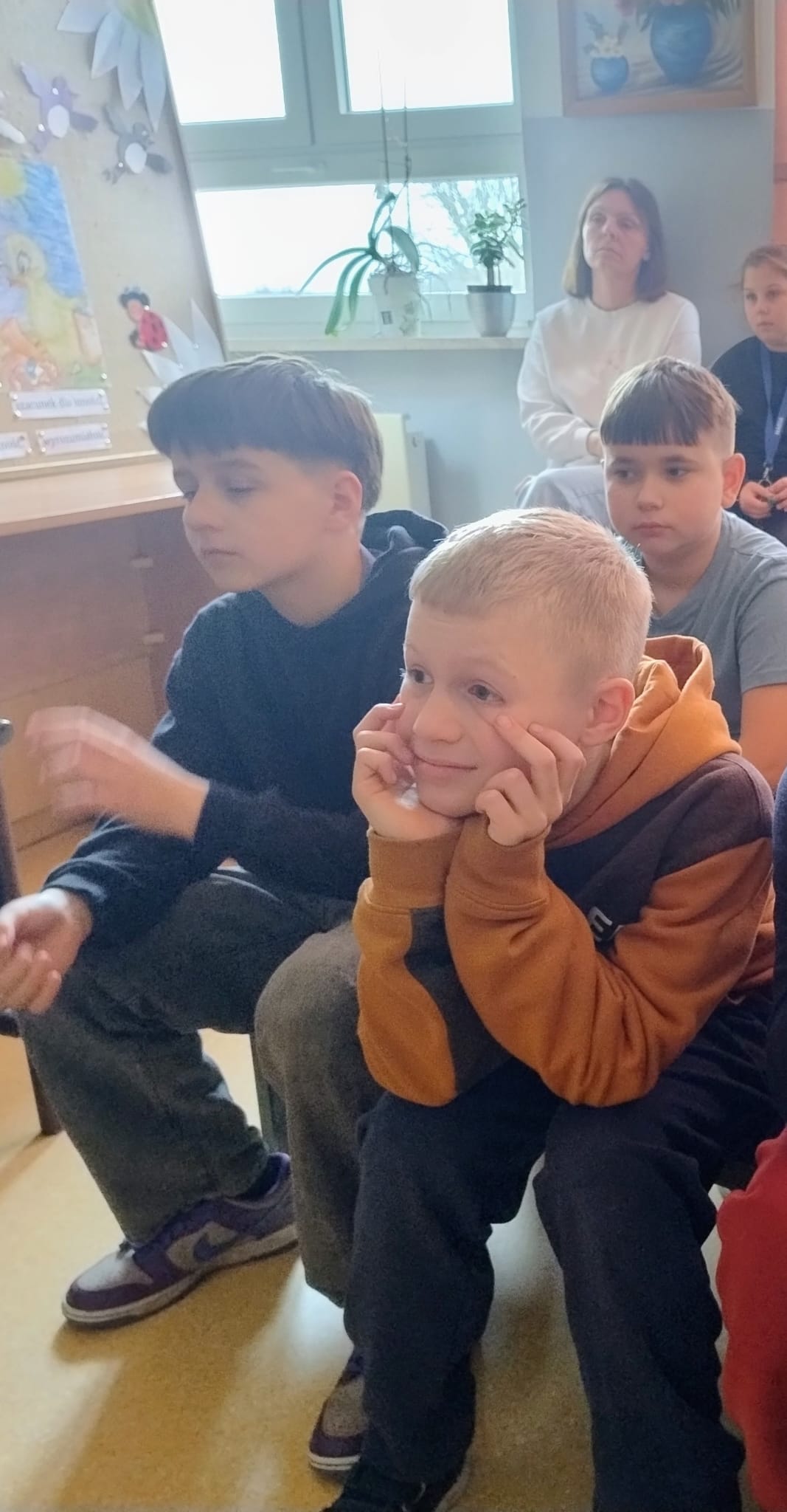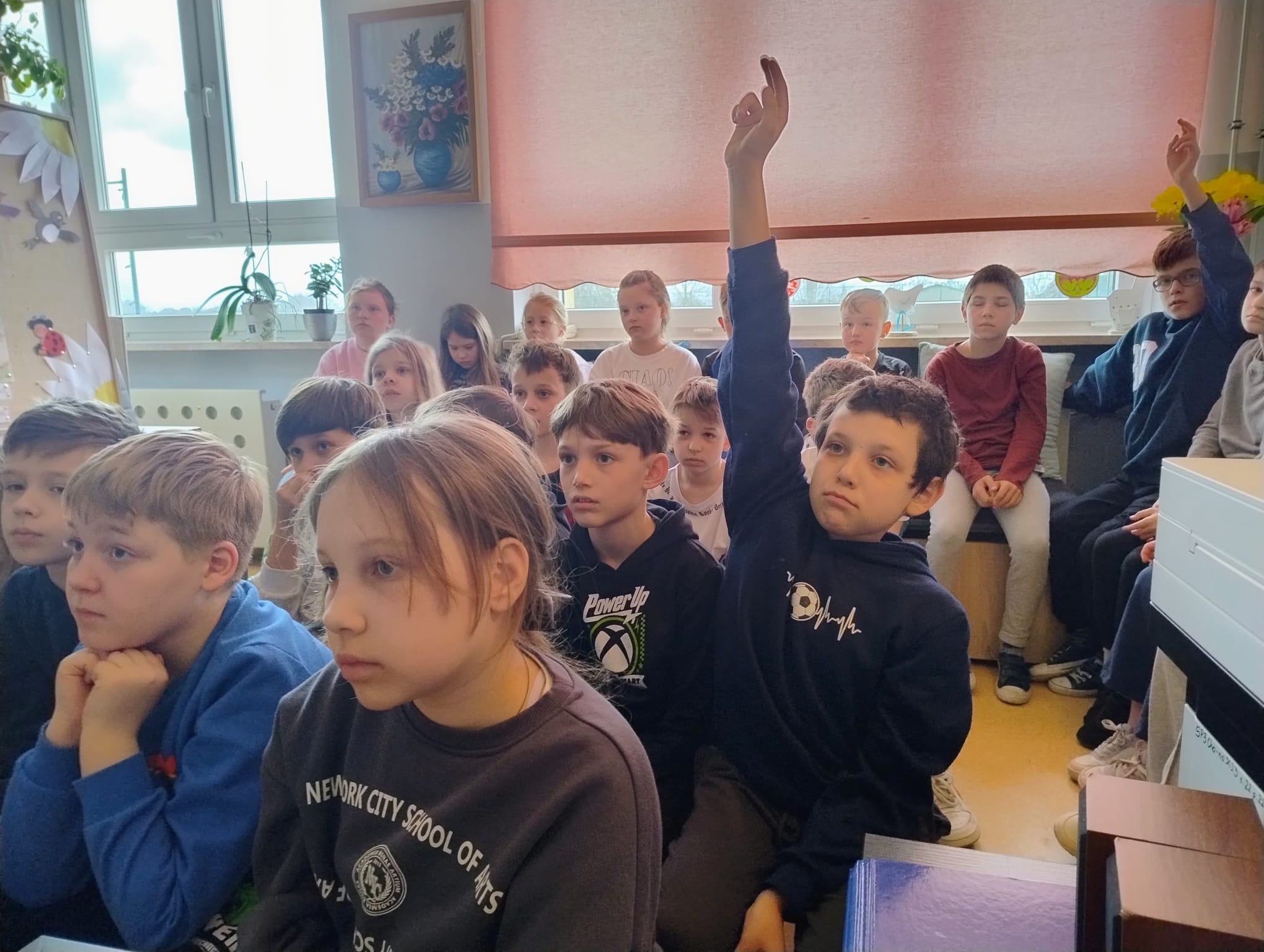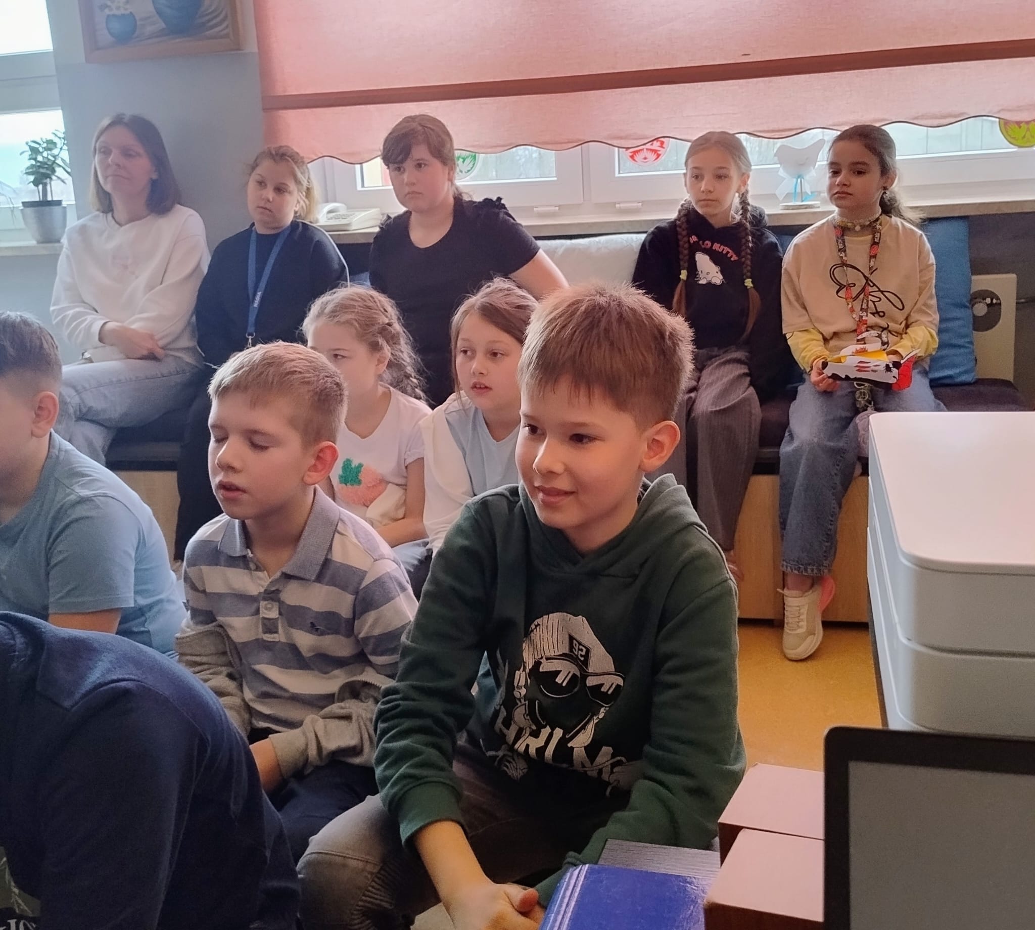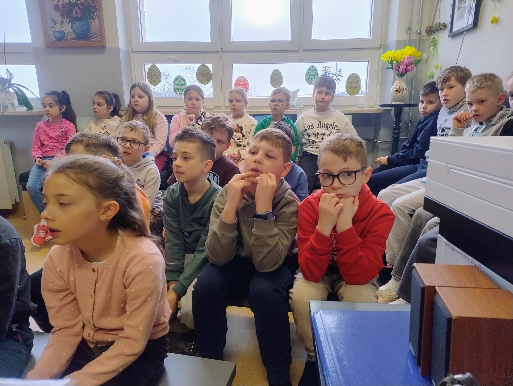 Hanna Ilnicka i Karina Kośkiewicz, uczennice z klasy szóstej, pięknie przeczytały baśń "Brzydkie Kaczątko" Hansa Christiana Andersena. Uczennice wykorzystały teatrzyk kamishibai. Natomiast Hanna Borek zadawała młodszym kolegom i koleżankom pytania i zagadki. Zajęcia prowadzone były w formie dramy. Dzieci wykazały się pomysłowością i udowodniły, że potrafią improwizować oraz wchodzić w różne w role.