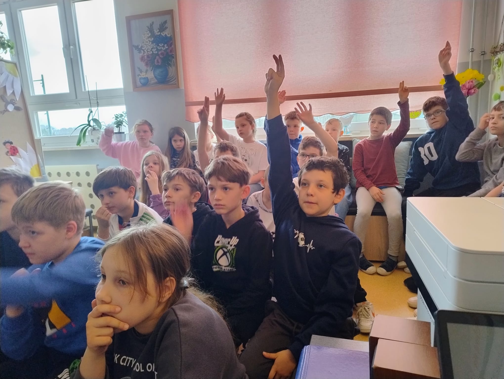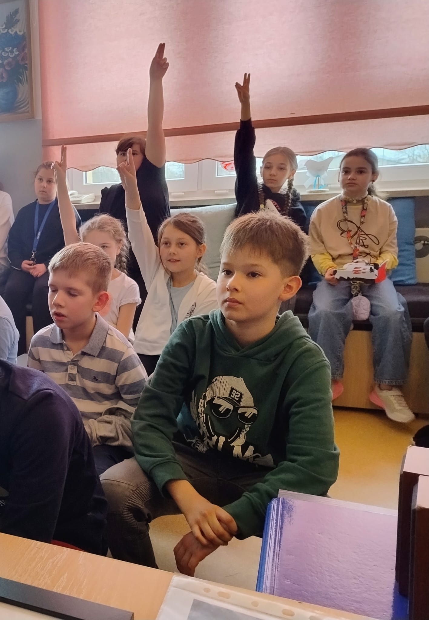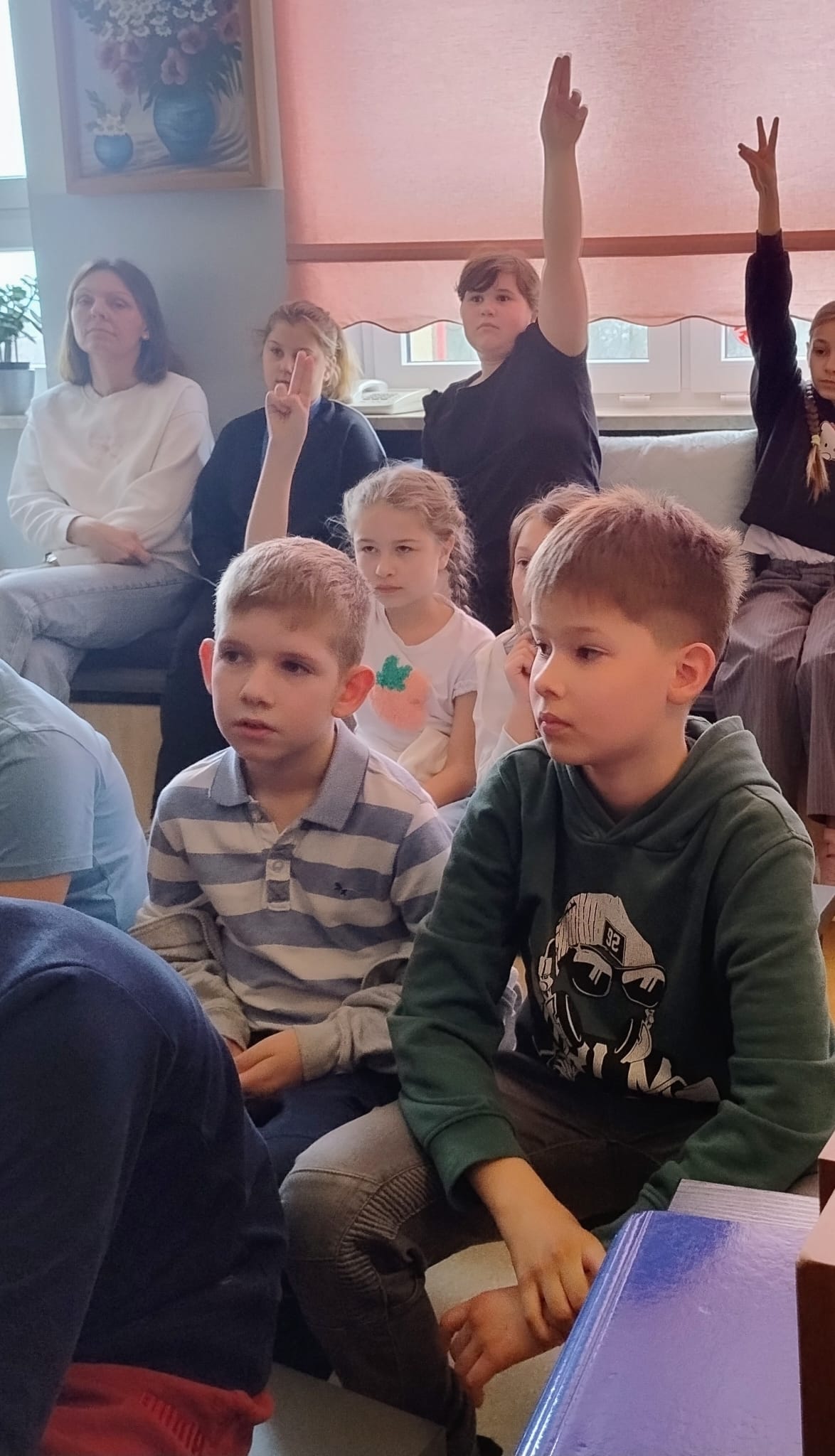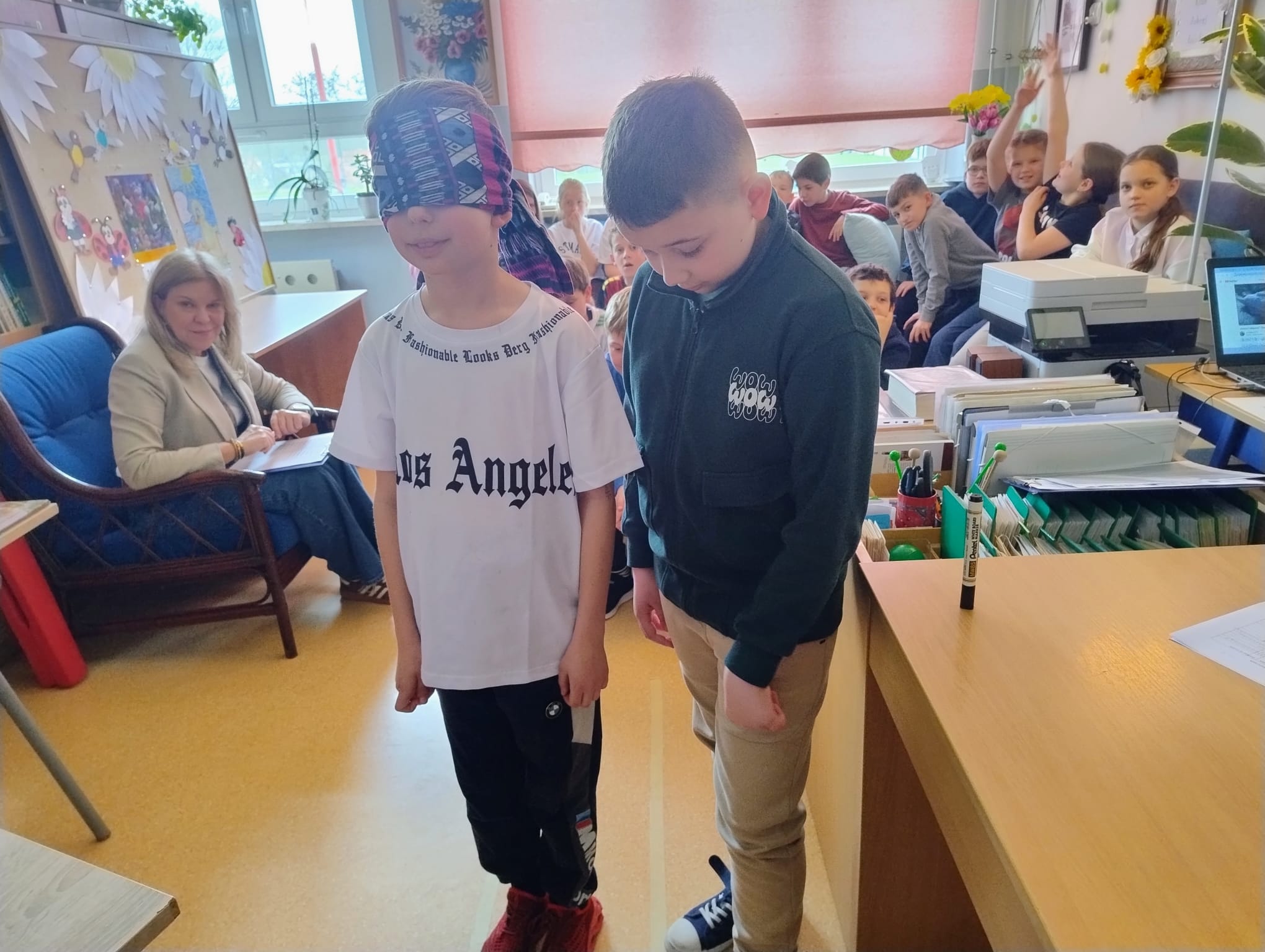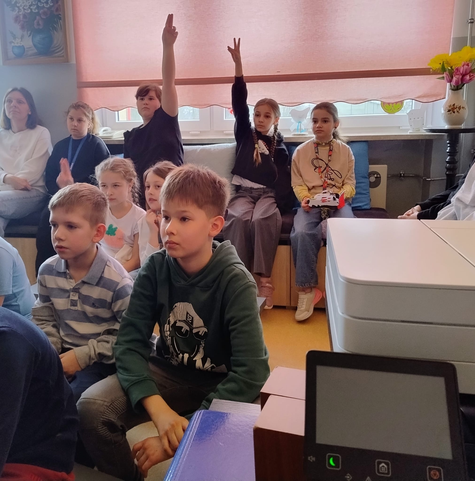 Hanna Ilnicka i Karina Kośkiewicz, uczennice z klasy szóstej, pięknie przeczytały baśń "Brzydkie Kaczątko" Hansa Christiana Andersena. Uczennice wykorzystały teatrzyk kamishibai. Natomiast Hanna Borek zadawała młodszym kolegom i koleżankom pytania i zagadki. Zajęcia prowadzone były w formie dramy. Dzieci wykazały się pomysłowością i udowodniły, że potrafią improwizować oraz wchodzić w różne w role.