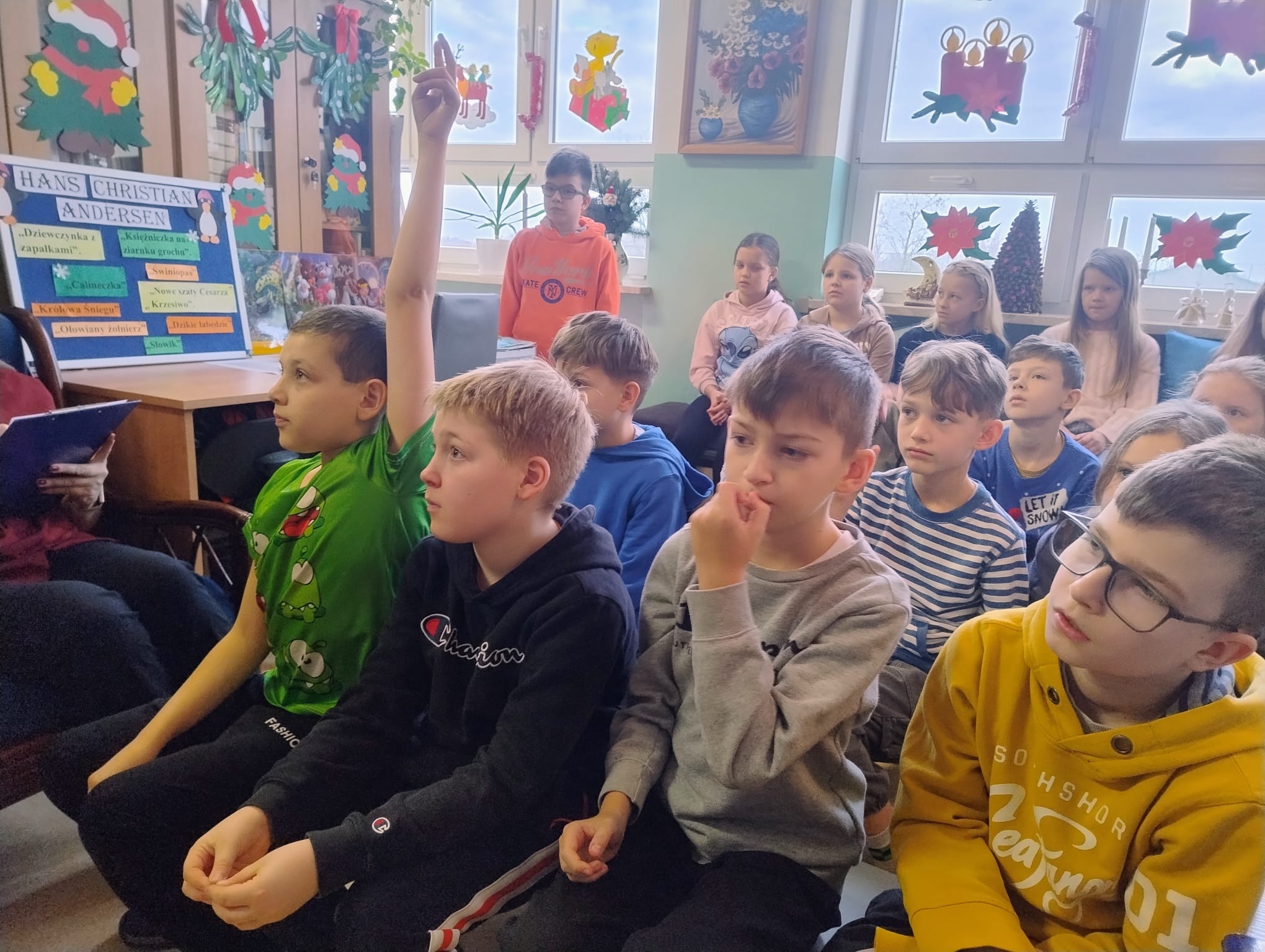 W naszej uroczystości uczestniczyły uczennice z klasy VI a i VI b, Karina Kośkiewicz, Hanna Borek i Oliwia Bryk . Uczennice przeczytały, a także omówiły tekst i przesłanie baśni Andersena pt. „Dziewczynka z zapałkami”, wykorzystując obrazkowy teatr kamishibai. Mnóstwo śmiechu i dobrej zabawy, aprzy okazji trening szarych komórek dostarczyły dzieciom zagadki związane z baśniami Andersena.